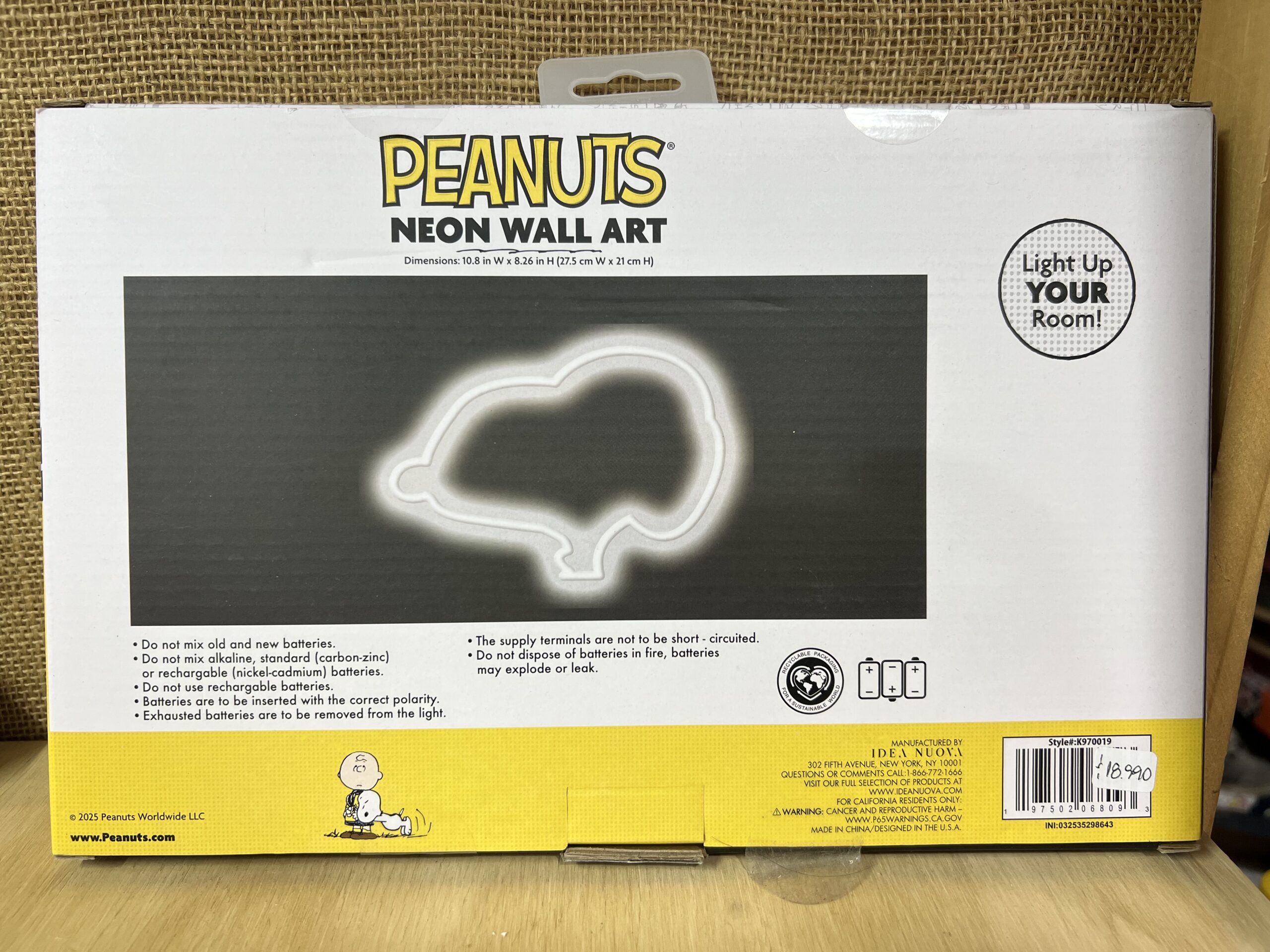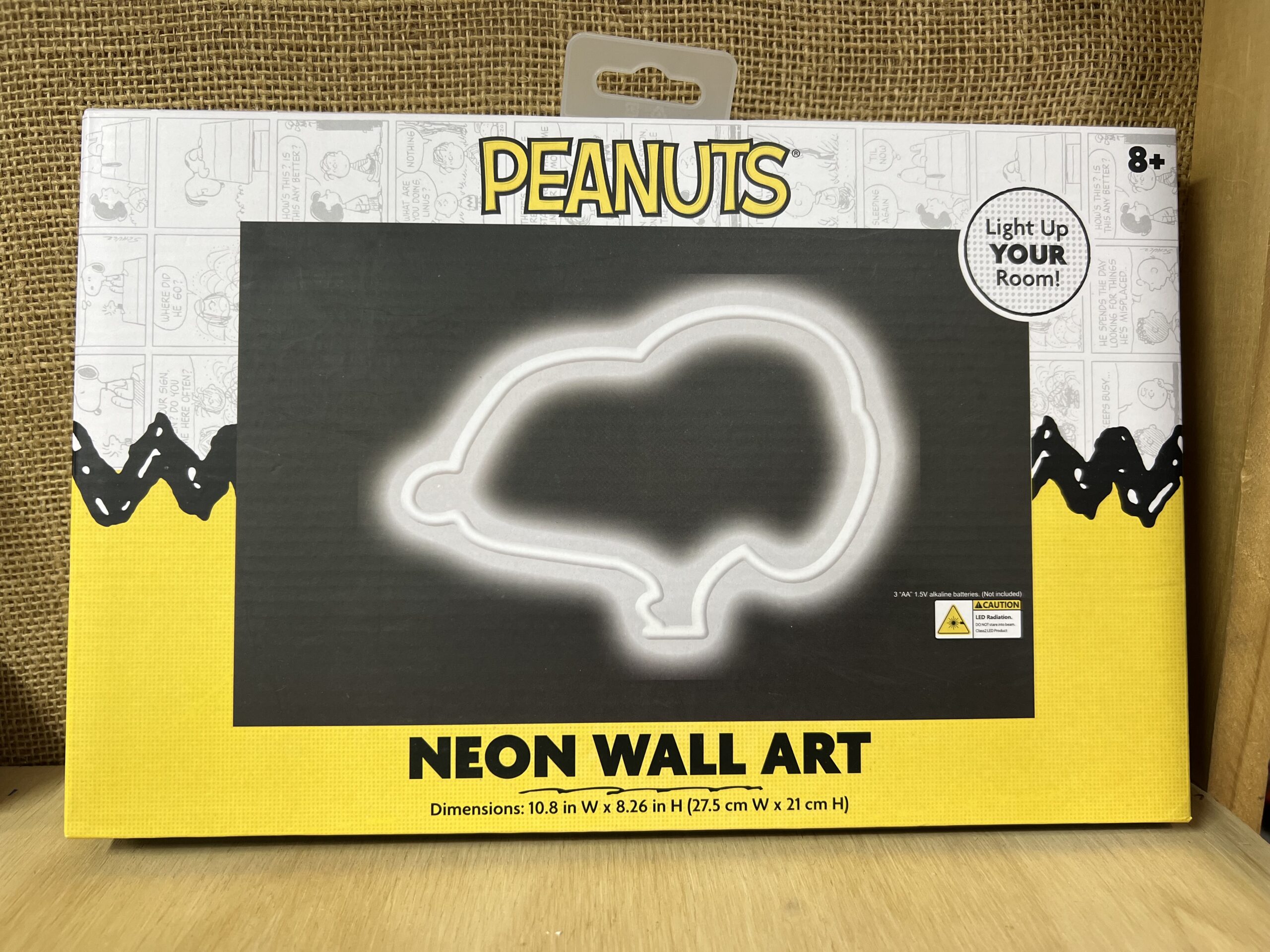 Luz neón decorativa de pared Peanuts, funciona con 3 pilas (no incluidas). Ideal para dormitorios, escritorios o espacios temáticos. Diseño llamativo inspirado en Snoopy y el universo Peanuts.